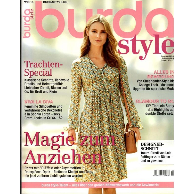 PLUS: TrachtenSpecial Klassische Schnitte, liebevolle Details und Heimatgefühl: Liebhaber-Dirndl, Blusen und Co. für Groß und Klein - ALLES IN BEWEGUNG Von Cheerleader-Style bis College-Look - das neue Upgrade für sportliche Mode - VIVA LA DIVA Feminine Silhouetten und verführerische Dekolletés à la Sophia Loren - sexy Retro-Looks in Gr. 44-52 - GLAMOUR TO GO DIY-Tipp: ein Spray das Highlights au dunkle Stoffe setzt - DESIGNERSCHNITT Traum-Dirndl von Lola Paltinger zum Nähen - und zu gewinnen - burda style-Talent - alles über den großen Nähwettbewerb und die Gewinnerin