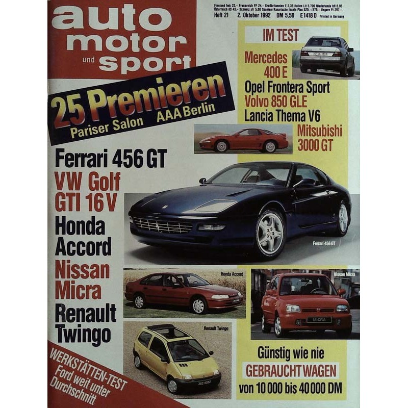Titelbild: 25 Premieren: Pariser Salon / AAA Berlin . Ferrari 456 GT, VW Golf GTI 16 V, Honda Accord, Nicssan Micra, Renault Twingo