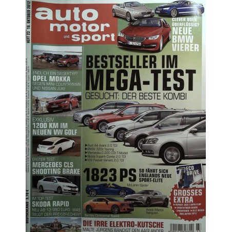 TITELTHEMEN Opel Mokka und seine Konkurrenten Erster Vergleich mit Mini Countryman und Nissan Juke BMW Vierer-Reihe Neues Coupe. Cabrio und Gran Coupe auf Dreier-Basis Mercedes CLS Shooting Brake Luxuriöser Sportkombi mit V8-Motor im Test Skoda Rapid 1.2 TSI Sehr geräumiger und preiswerter Kompaktwagen im Test Fahren ohne Furcht Malte Jürgens bändigt die Elektro-Kutsche Aaglander Mittelklasse-Kombis Audi A4 Avant, BMW Dreier Touring, Mercedes C-Klasse T, Skoda Superb Combi und VW Passat Variant. Vergleichstest 1200 km mit dem neuen VW Golf Roadmovie von Sardinien bis Stuttgart Englische Supersportwagen Aston Martin Vanquish, Bentley Continental GT Speed und McLaren MP4-12C Spider im Fahrbericht