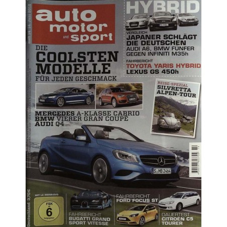 PLUS: Fahrbericht: Bugatti Grand Sport Vitesse und Ford Focus ST - Dauertest: Citroen C5 Tourer - Hybrid: Vergleich Japaner schlägt die Duetschen, Audi A6, BMW Fünfer gegen Infiniti M35h - Fahrbericht: Toyota Yaris Hybrid, Lexus GS 450h - Reise Spezial: Silvretta Alpen Tour