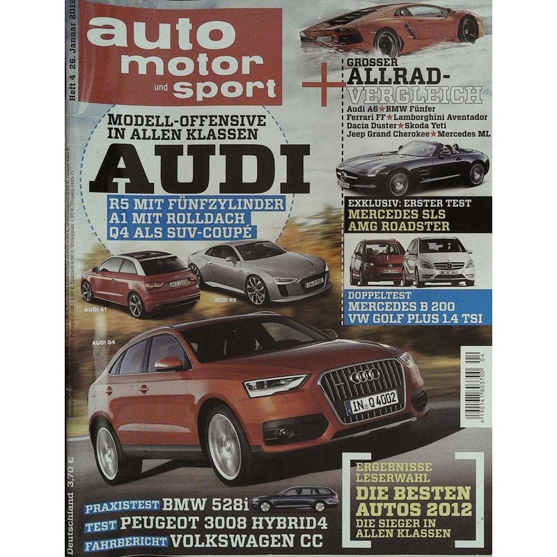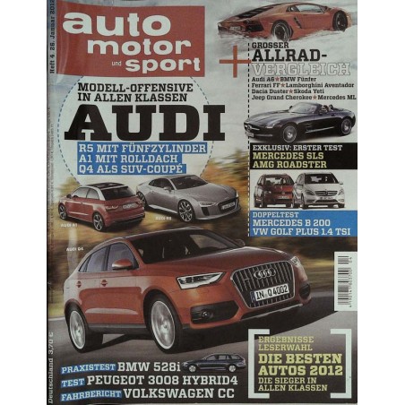 PLUS: Grosser Allrad-Vergelichstest: Audi A6, BMW Fünfer, Ferrari FF, Lamborghini Aventador, Dacia Duster, Skoda Yeti, Jeep Grand Cherokee, Mercedes ML - Erster Test: Mercedes SLS AMG Roadster - Doppeltest: Mercedes B 200, VW Golf Plus 1.4 TSI - Praxistest: BMW 528i, Test: Peugeot 3008 Hybrid4 - Fahrbericht: Volkswagen CC - Die besten Autos 2012
