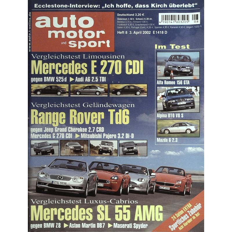 PLUS: Ecclestone Interview: Ich hoffe, dass Kirch überlebt - Vergleichstest Limousinen: Mercedes E 270 CDI gegen BMW 525d und Audi A6 2.5 TDI - Vergleichstest Geländewagen: Range Rover Td6 gegen Jeep Grand Cherokee 2.7 CRD, Mercedes G 270 CDI, Mitsubishi Pajero 3.2 Di-D - Im Test: Alfa Romeo 156 GTA, Alpina B10 V8 S, Mazda G 2.3 - Sportliches Zubehör: Acht Aluräder im Test