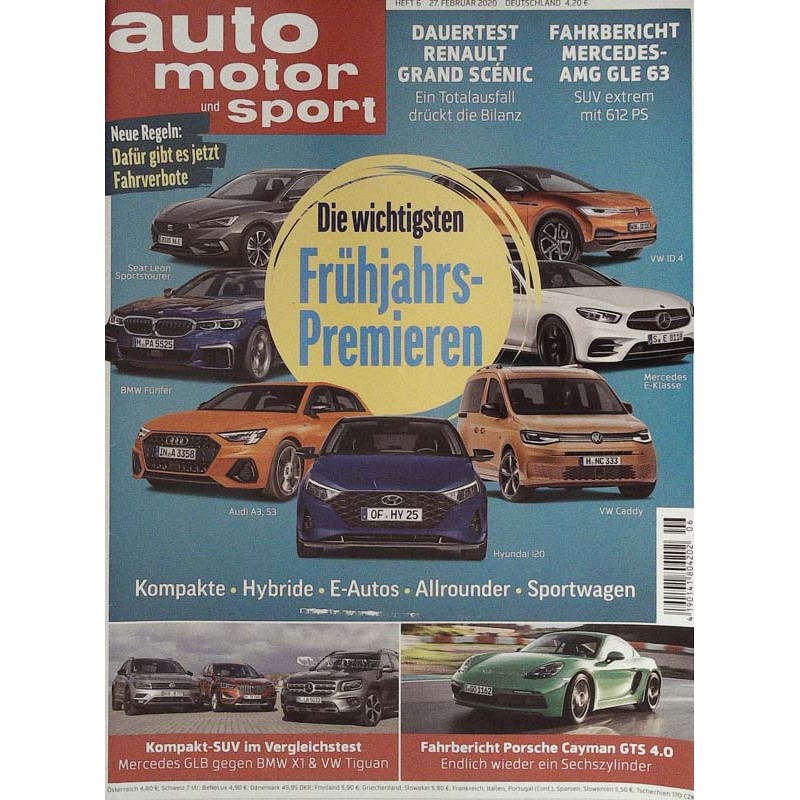 PLUS: Neue Regeln: Dafür gibt es jetzt Fahrverbote - Dauertest Renault Grand Scenic: Ein Totalausfall drückt die Bilanz - Fahrbericht Mercedes AMG GLE 63: SUV extrem mit 612 PS - Kompakt-SUV im VErgleichstest: Mercedes GLB gegen BMW X1 & VW Tiguan - Fahrbericht Porsche Cayman GTS 4.0: Endlich wieder ein Sechszylinder