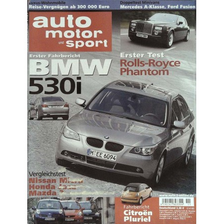 Kostenvergleich Benziner und Diesel: sechs Modellvarianten Audi A.4 2.0/1 .9 TDI, BMW 735i/ 740 d, Jeep Cherokee 2.4/2.5 CRD, Mercedes E 240 T/E 270 CDI t Opel Zafira 1.8/2.2 DTI, VW Golf 1.6/1.9 TDI Ferrari 360 Modena Challenge Stradale, Audi AS 4.0 TDI Quattro Gefahren und getestet Honda Jazz 1.4i, Mazda 2 MZI 1.4, Nissan Miaa 1.2 Drei hoch bauende japanische Kleinwagen konkurrieren im Vergleichstest Rolls-Royce Phantom Englisch-bayerische Luxuslimousine mit 6,75-Liter-V12 im Test Mercedes 300 SL Flügeltürer Legendärer Sportwagen mit HWA-Technik neu belebt. Impression