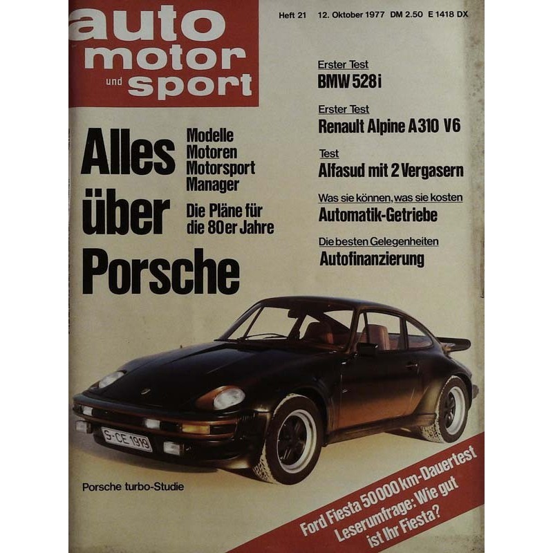Test und Technik Alles über Porsche Es begann in Österreich Wie die Idee vom Porsche-Wagen verwirklicht wurde Was es alles gab Wenig bekannte Porsche-Modelle und ungewöhnliche Auftragsentwicklungen Die Denkfabrik Im Entwicklungszentrum Welssach entstehen nicht nur Porsche-Autos Klein aber fein Porsche in Zahlen Das Programm Modelle und Preis Wahlverwandtschaften Die Geschichte der Porsche-Motoren. Alles, nur nicht Formel 1 Geschichte und Zukunft des Porsche-Sports. Vom 958 bis zum 928 20 Jahre Porsche In auto motor und Sport. Am kleinen Doktor kommt keiner vorbei Männer, die bei Porsche die Welchen stellten Schnelle Cheft Das Management. Eine echte Konkurrenz sehen wir nicht Interview mit Dr. Ing. Ernst Fuhrmann, Sprecher des Vorstands der Dr. Ing. h. c. Porsche AG, über die Zukunft des Unternehmens Reifezeugnis 50000 km-Dauertest. Wie ausgereift ist der Ford Fiesta? Aus Forschung und Entwicklung Nachrichten aus der Technik Gert Hacks Notizen Ein Jahr Fiesta auto motor und sport-Leserumfrage: Wie hat sich der Ford Fiesta in Kundenhand bewährt? Neues Zubehör schalten oder schalten lassen Was spricht für Automatikgetriebe und was dagegen? Goldene Mitte Kurztest BMW R 80/7: neues Motorrad mit BOO cm, Hubraum und 55 PS Leistung Fünf mit Zusatzziel Test BMW 528 1: neues Spitzenmodell der Fünfer-Reihe für besonders leistungsbewußte Kunden Rückenwind Test Alpine Renault A 310 V6* französischer Sportwagen mit Sechszylinder-Heckmotor Saft und Kraft Kurztest Alfasud L 5m (Steinmetz-Tuning): Alfasud mit zwei Doppelvergasern und höherer Leistung Vor 20 Jahren Jahreswagen Erfolgreiche Autos (11): Simca 1100
