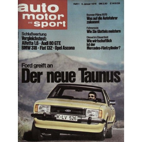 PLUS: Bonner Pläne 1976: Was auf die Autofahrer zukommt - Schlußwertung Vergleichstest: Alfetta 1.6, Audi 80 GTE, BMW 318, Fiat 132, Oepl Ascona - Fahrpraxis: Wie Sie Glatteis meistern - Diesel im Dauertest: Wie wirtschaftlich ist der Mercedes Fünfzylinder?