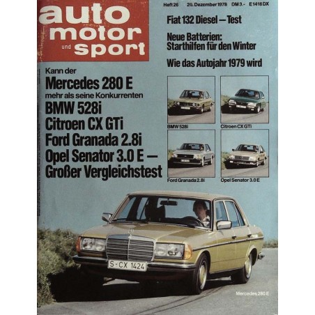 Test und Technik Gute Gesellschaft Vergleichstest obere Mittelklasse. Die Konkurrenten: BMW 5281, Citroen CX 2400 GT1, Ford Granada 2.8 i Ghia S, Mercedes 280 E, Opel Senator C 3.0 E Prüfstand Nachrichten aus der Technik Selbstzünder Test Fiat 132 D: neues Fiat-Modell mit 2,5 Liter-Dieselmotor Neues Zubehör Vom Leichtmetall-Rad bis zum Pannen-Set. Raten Sie mal Was Bedienungs-Symbole bedeuten (8) Motorrad-News Vom Motorrad-Anzug bis zum Fernseh-Spiel Zweite Generation Test Honda 750 K: neues japanisches Vierzylinder-Motorrad mit 77 PS Aus Forschung und Entwicklung Der neue Turbo-Dieselmotor von BMW Vierer-Bob Viertürige Spezial-Version des amerikanischen Sportwagens Chevrolet Corvette