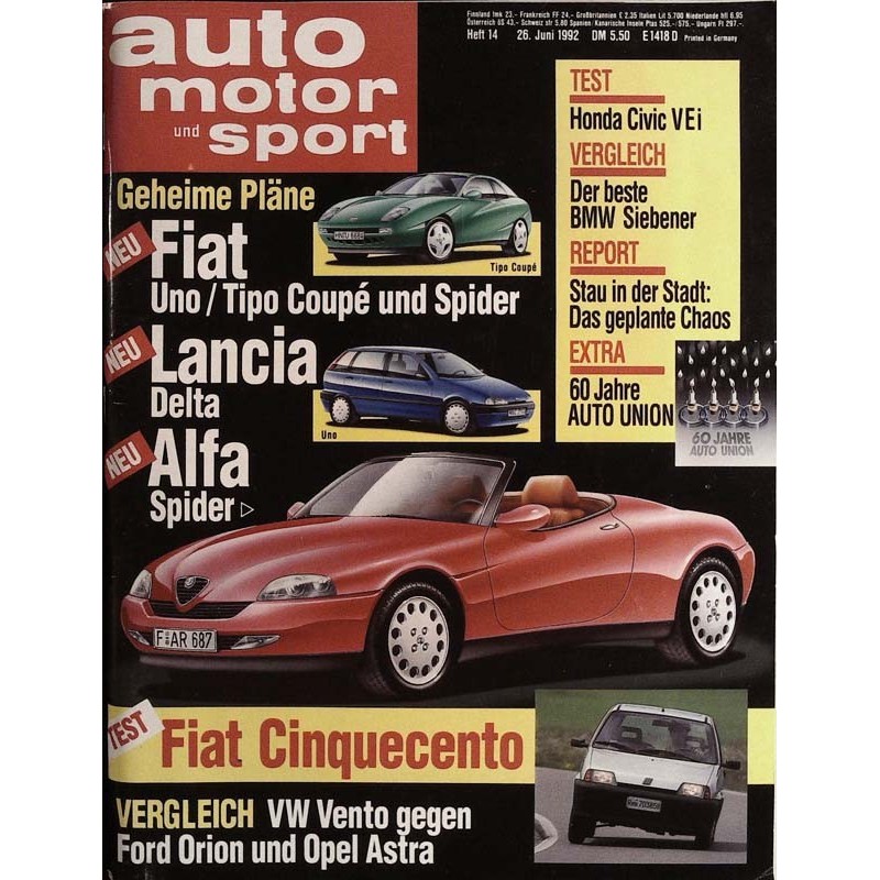 PLUS: Neu: Lancia Delta und Alfa Spider - Test Fiat Cinquecento - Vergleich: VW Vento gegen Ford Orion und Opel Astra - Test: Honda Civic VEi - Vergleich: Der beste Siebener BMW - Report: Stau in der Stadft, das geplagte Chaos - Extra: 60 Jahre Auto Union