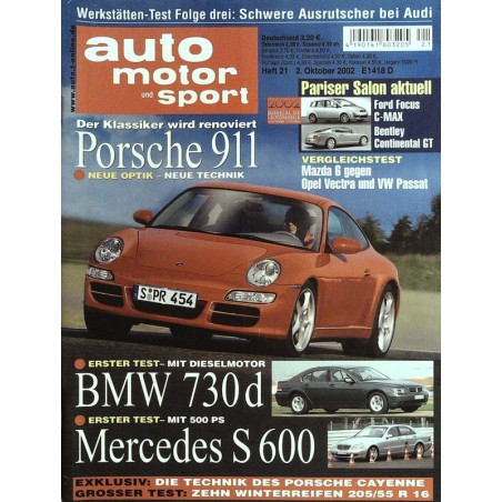 PLUS: Werkstätten-Test folge drei: Schwerer Ausrutscher bei Audi - Pariser Salon aktuell: Ford Focus C-Max, Bentley Continental GT - Vergleichstest: Mazda 6 gegen Opel Vectra und VW Passat - Erster Test mit Dieselmotor: BMW 730d - und Mercedes S600 mit 500 PS - Exklusiv: Die Technik des Porsche Cayenne - Grosser Test: Zehn Winterreifen 205/55 R 16