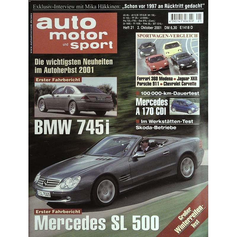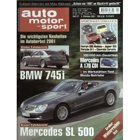 PLUS: Die wichtigsten Neuheiten im Autoherbst 2001 - Erster Fahrbericht: BMW 745i - Exklusiv Interview mit Mika Häkkinen: Schon vor 1997 an Rücktritt gedacht - Sportwagen Vergleich: Ferrari 360 Modena, Jaguar XKR, Porsche 911, Chevrolet Corvette - 100000 km Dauertest: Mercedes A 170 CDI - Im Werkstätten tEst: Skoda Betriebe - Großer Winterreifen Test