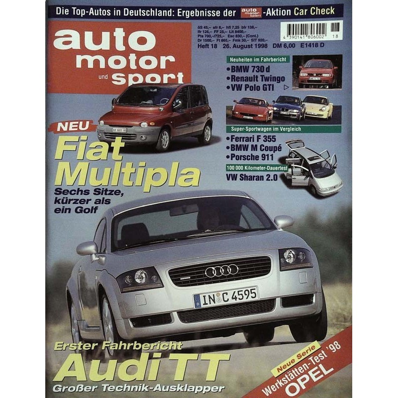 PLUS: Fiat Multipla: Sechs Sitze, kürzer als ein Golf - Die Top Autos in Deutschland:  Ergebnisse der AMS Aktion Car Check - Neuheiten im Fahrbericht: BMW 730 d, Renault Twingo, VW Polo GTI - Super SPortwagen im Vergleich: Ferrari F 355, BMW M Coupe, Porsche 911 - 100 000 Kilometer Dauertest: VW Sharan 2.0 - Neue Serie: Werkstaätten Test 98 Opel