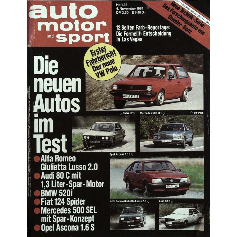 TEST & TECHNIK Stil-Probe Fahrbericht VW Polo Neuauflage des kleinsten VW-Modells mit praktischem Steilheck Große Klasse Test Mercedes 500 SEL Top-Limousine der S-Klasse mit verlängertem Radstand und neuem Energiekonzept. Vor 20 Jahren auto motor und sport in Heft 22 und 23/1961 Gemischtes Doppel Test Opel Ascona 1.6 S Frontgetriebene Schräg- oder Stufenhecklimousine mit 90 PS-Motor Prüfstand Nachrichten aus der Technik Gert Hack Notizen Frommer Wunsch Rumpel-Stils Ende Nach 19 Jahren stellt Ford Köln die Produktion von V4-Motoren ein Am Kiosk Ausländische Autojournale über Fiat Panda 45, Citroen Visa II Super X, Toyota Starlet Namensvetter Test BMW 520i Neue Sechszylinder-Limousine mit Benzineinspritzung Wer Wind sät... Fritz B. Busch über die aerodynamische Entwicklung der Autos Aus Forschung und Entwicklung Hohes C Test Audi 80C Neues Einstiegsmodell mit verbrauchsoptimiertem- Motor und Economy-Getriebe Offene Renaissance Test Fiat 124 Spider Der italienische Zweisitzer lebt in modifizierter Ausführung wieder auf Motorrad-News Forschungsauto von Daimler-Benz Neue Technik-Serie Teil 3 Glanz und Gloria Die Autosammlung des Amerikaners Jack Nethercutt Stern-Fahrten Clubleben in Deutschland: Mercedes-Veteranen gelten als Wertanlage Das Original Der erste Sportwagen yon Porsche: Typ 356 Auto-Karriere Der Visa wurde zu einem der wichtigsten Modelle im Citroen-Programm Neues Zubehör Test Alfa Romeo Giulietta Lusso 2,0 Spitzen-Version der italienischen Sportlimousine Donner-Keil Test Suzuki GSX 1100 S Katana Japanisches Super-Motorrad mit deutschem Styling Reisen in den Winter Soweit die Kufen tragen Mit Snowmobilen durch die Winterlandschaft Kanadas Viel Spaß Was das französische Les Arcs Skifahrern bietet French Connection Was der Club Méditerranée im französischen Avoriaz Skifahrern zu bieten hat Warum in die Ferne schweifen? Das Alpin- und Langlaufangebot deutscher Wintersport-Orte Rum ist in der kleinsten Hütte Wo Skifahrer noch einen zünftigen Urlaub in den Alpen verbringen können Nordische Kombination Skandinavien wird als Winterreise-Ziel immer beliebter Vom Winde verwohnt Die arabischen Emirate als Wintertip für Windsurfer Zimmer mit fließend Wasser Wie Urlauber Ägypten mit einem Hotelschiff entdecken können Sonnenseite Tips, Trips, Trends