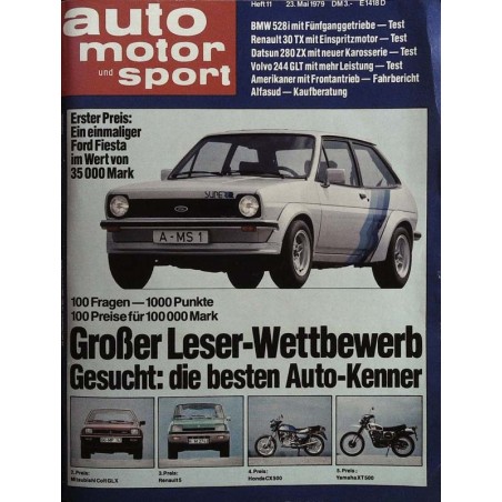 Test und Technik Der große Preis Fiesta Super, Hauptgewinn im auto motor und sport-Wettbewerb ”Gesucht. die besten Autokenner" Dauertest-Report BMW 733 i, 'Simca Horizon, Ford Granada Turnier, Peugeot 305. Prüfstand Nachrichten aus der Technik Gert Hacks Notizen Die wundersame Wandlung von Volvo Blick zurück im Zorn US-Präsident Jimmy Carter beschloß den Tod dor amerikanischen Straßenkreuzer „Die Europäer sind uns weit überlegen" Interview mit dem amerikanischen Verkehrsminister Brock Adams über die Entwicklung sparsamer Autos „Wir müssen mit den Vorschriften leben" Interview mit Philip Caldwell, Präsident der Ford Motor Company, über die Zukunft der amerikanischen Automobilindustrie Neues Zubehör Vorn Dekor-Set bis zur Kinder-Sicherheitsweste Sportversion Test BMW 528 i. Spitzenmodell der Fünfer-Reihe mit sportivem Fahrwerk und fünf Gängen Aus Forschung und Entwicklung Neues Sicherheitsrad von Dunlop Safety fast Test Volvo 244 GLT: sportliche Version des Volvo 244 mit mehr Leistung Vor 20 Jahren auto motor und Sport in Heft 11 und 12/1959 Formel X Fahrbericht Chevrolet Cltation: Kleine Amerikaner sollen in Europa Karriere machen Spritzenkraft Test Renault 30 TXt Renault-Spitzenmodell jetzt auch mit Einspritzmotor Wie die Kraft nach vorne kam Der späte Siegeszug des Frontantriebs Die Entscheidung Die Wankel-Absage von Audi NSU begünstigt die Japaner Fair Lady Test Datsun 280 ZX: Japans Erfolgs-Sportwagen präsentiert sich in neuem Gewand Motorrad-News Vom Tellewaschgerät bis zur Egli-Kawasaki Leichte Kawallerie Test Kawasaki Z 250: Mittelklasse-Motorrad von Kawasaki mit sportlicher Note
