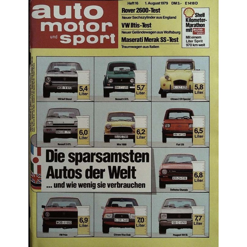 Test und Technik Auf Liter und Pfennig Die sparsamsten Autos der Welt Citroen 2 CV Special, Citroen Visa Club, Daihatsu Charade, Fiat 126, Mini 1000, Peugeot 104 GL, Renault 4 GTL, Renault 5 GTL, VW Polo, VW Golf Diesel Just for fans Test Maserati Merak SS: exclusiver italienischer Mittelmotor-Sportwagen Prüfstand Nachrichten aus der Technik Gert Hacks Notizen Betrifft: Sparsame Autos Rovercraft Test Rover 2600: neues Modell mit Sechszylindermotor Dauertest-Report BMW 733 I; Simca Horizon; Ford Granada; Peugeot 305; Opel Senator Neues Zubehör Vom Fahrradträger bis zum Lackpflegemittel Test Intern Aus der Testpraxis von auto motor und sport Wehrbeauftragter Test VW Jltis: neuer Geländewagen des VW-Konzerns für die Bundeswehr Rädchen für allesTest Honda XL 185 S: kleinste Enduro des größten japanischen Motorrad-Herstellers
