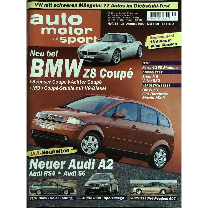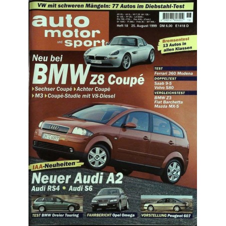 PLUS: VW mit schweren Mängeln: 77 Autos im Diebstahl Test - IAA-Neuheiten: Neuer Audi A2, Audi RS4, Audi S6 - Bremsentest: 13 Autos in allen KLassen - Test: Ferrari 360 Modena - Doppeltest: Saab 9-5 und Volvo S80 - Vergleichstest: BMW Z3, Fiat Barchetta und Mazda MX-5 - Test: BMW Dreier Touring - Fahrbericht: Opel Omega - Vorstellung: Peugeot 607