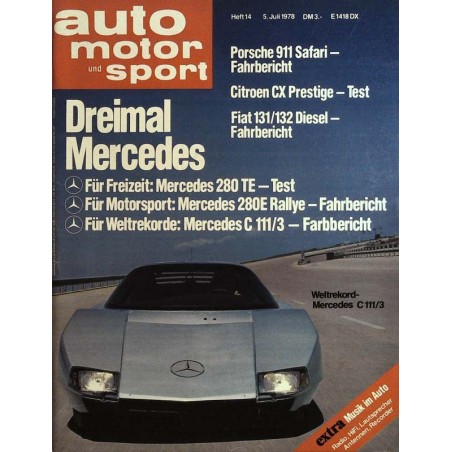 Test und Technik Afrika-Korps Fahrbericht Safari-Porsche 911 SC und Safari Mercedes 280 E: Porsche-Sportwagen und Mercedes-Limousine Im Safari-Rallyetrimm Prüfstand Nachrichten aus der Technik Hartmacher Test Opel Rekord S: Sportausstattung für die Opel-Limousine TE-Expreß Test Mercedes 280 TE: Neuer Mercedes-Kombi auf der Basis der W 123 Limousinen-Baureihe Prestige-Objekt Test Citroen CX Prestige: Luxus-Modell der CX-Baureihe mit verlängertem Radstand Öl-Tanker Fahrbericht Fiat Diesel: Fiat präsentiert Diesel-Versionen der Modelle 131 und 132 Stern-Fahrt Die Anatomie des Rekordjägers Mercedes C 111/3 Das große Zweimaleins Test Yamaha SR 500/XT 500: Straßen- und Enduro-Modell mit 500 cm, Einzylinder-Motor Motorrad-News Von der Honda Eurosport bis zum Jet-Helm Neues Zubehör Vom Leichtmetallrad bis zum Insektenlöser