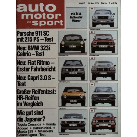Test und Technik Die gelbe Gefahr Test Japanische Mittelklasse: Wie gut sind Japanische Autos? auto motor und spart prüfte Datsun 200 L, Honda Accord 1600, Mazda 929, Mitsubishi Galant Sigma 2000 GLX und Toyota Cressida Porsches guter Ruf Test Porsche 911 SC Ruf an Fahrwerk und Motor modifizierter Heckmotor-Sportwagen Prüfstand Nachrichten aus der Technik Vom Winde verweht Test BMW 3231/Baur Cabrio: neues Hardtop-Cabriolet von Baur auf der Basis der BMW-Dreierreihe Hohes Niveau HR-Gürtelreifen der Serie 70 im Vergleich: Continental TS 772, Firestone HS-1, Fulda Rasant Steel, Metzeler Perfect Speed, Michelin XVS, Pirelli CN 58 SM, Uniroyal Rallye 240/70 Motorrad-News Mittelstand Fahrbericht BMW R 45/R 65: drei neue Mittelklasse-Maschinen mit 27, 35 und 45 PS Kluger Kopf Peugeot-Ersatzteilchef In Deutschland Hubert Pignol Ford forte Test Ford Capri 3.0 S* Capri der dritten Generation mit Dreiliter-Sechszylinder-Motor Aus Forschung und Entwicklung Frischer Wind Fahrbericht Fiat Ritmo Ein neues Fiat-Modell soll das Fiat-Geschäft ankurbeln