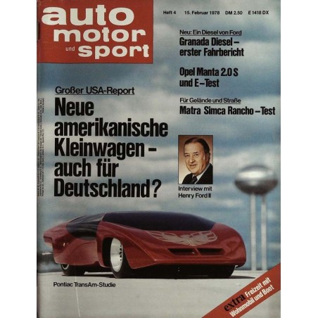 Test und Technik Die amerikanische Tragödie Das Ende der US-Straßenkreuzer und dessen Auswirkungen auf die Autowelt „Wir sind um unser Land besorgt" Interview mit Henry Ford II über die Pläne der amerikanischen Automobilindustrie Kleinkrieg In Amerika entsteht eine neue Auto-Generation nach deutschem Vorbild „Das Show Business Ist vorbei" Interview mit General Motors-Chef Elliott Estes über die Zukunft der amerikanischen Autos Vernunftehe Fahrbericht Ford Granada 2.1 DL: Ford Granada mit Dieselmotor von Peugeot Nachrichten aus der Technik Geil Hacks Notizen Ein Jahr Ford Fiesta Ford nimmt Stellung zur Leserkritik am Fiesta Verstärkung Kurztest Opel Manta 2.0 S/2.0 E: neue Manta-Versionen mit Zweiliter-Motoren Testspiegel Ausländische Auk-Journale über Audi 100/5E BMW 320, Opel Rekord 2,0 S Neues Zubehör Grand mit Vieren Kurztest Honda CB 400 F einziges Vierzylinder-Motorrad in der 27 PS-Klasse Druck-Technik Regelsysteme fur Turboladermotoren Das Spielmobil Test Matra Simca Ranchcc Freizeitauto im Gelandewagen-Look auf Simca-Basis