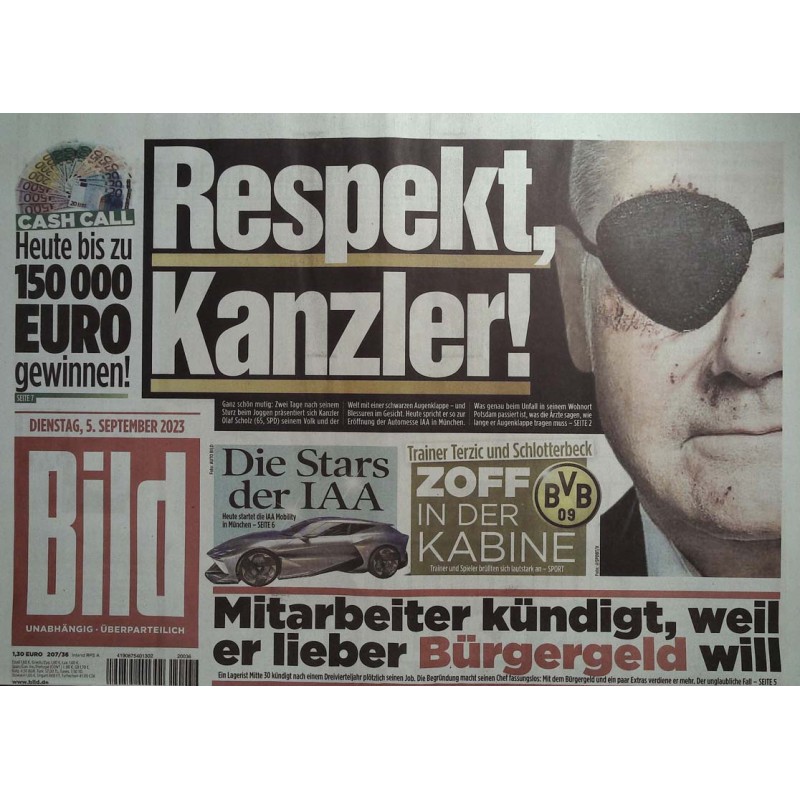 Titelblatt: Respekt, Kanzler! Olaf Scholz hatte einen Unfall (Sturz) in Potsdam und trägt jetzt eine Augenklappe