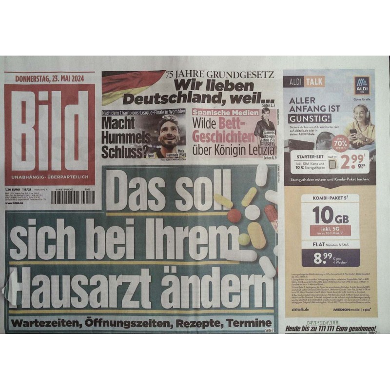 Deutsche Bild Zeitung vom Donnerstag den 23.05.2024
