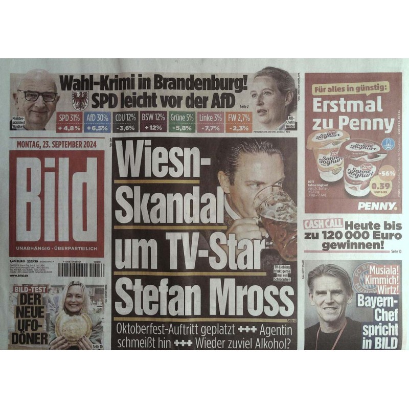 PLUS: Wahl-Krimi in Brandenburg! SPD leicht vor der AfD - Bayern Chef spricht in Bild - Bild Test: Der neue UFO Döner - Limonade erhöht Schlaganfall Risiko - Bild des Tages: Tennis ist gross in Mode