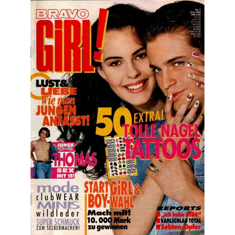 PLUS: Lust und Liebe: Wie man Jungen anfasst - Junge 94: Thmas hatte Sex mit 13 - Start Girl und Boy Wahl - Reports: Ich habe Aids, Kahlschlag total und Sekten Opfer - Mode: Clubwear - Minis: wildleder - Super Schmuck: Zum Selbermachen