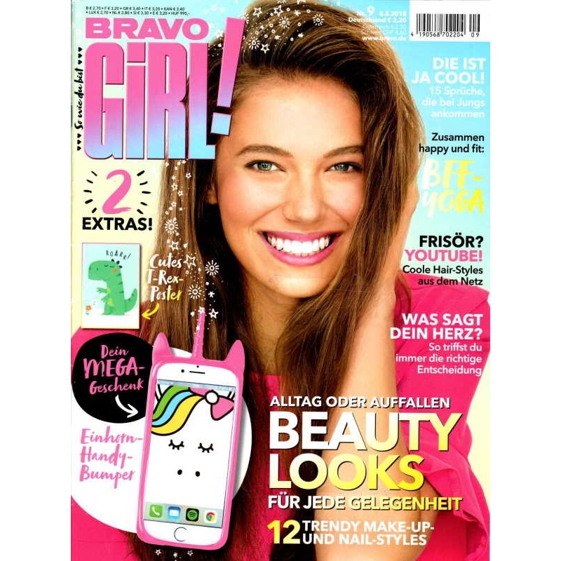PLUS: Die ist ja cool: 15 Sprüche, die bei Jungs ankommen - Zusammen fit und happy: BFF-Yoga - Frisör? Youtube! Coole Hair Styles aus dem Netz - Was sagt dein Herz? So triffst du immer die richtige Entscheidung - Extra: Einhorn Handy Bumper (evtl. enthalten) - Poster: T-Rex (evtl. enthalten)