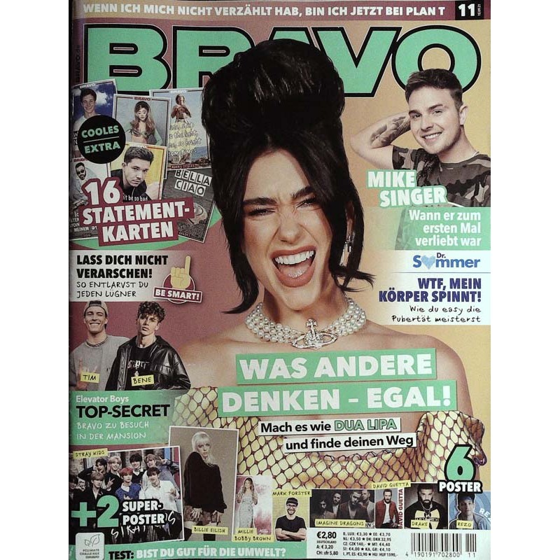 PLUS: Wenn ich mich nicht verzählt hab, bin ich jetzt bei PLan T - Mike Singer: Wann er zum ersten Mal verliebt war - Dr. Sommer: WTF, mein Körper spinnt! Wie du easy die Pubertät meisterst - Lass dich nicht verarschen! So entlarvst du jeden Lügner - Elevator Boys: Top Secret Bravo zu besuch in der Mansion - Test: Bist du gut für die Umwelt? - Poster: Billie Eilish, Stray Kids, Millie Bobby Brown, Imagine Dragons, David Guetta, Drake, Rezo (zum Teil enthalten) - Extra: 16 Statement Karten (evtl. enthalten)