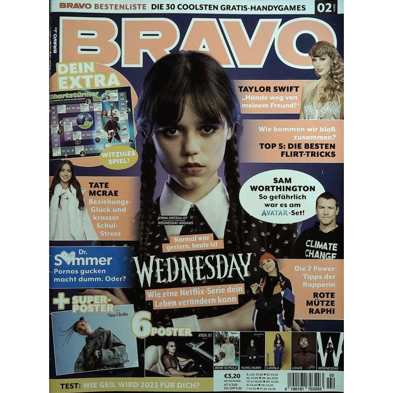 PLUS: Tate Mcrae: Beziehungsglück und krasser Schul-Stress - Bravo Bestenliste: Die 30 coolsten Gratis Handygames - Taylor Swift: Hände weg von meinem Freund - Wie kommen wir blß zusamen? Top 5, die besten FLirt Tricks - Sam Worthington: So gefährlich war es am Avatar-Set - Die 7 Power-Tipps der Rapperin: Rote Mütze Raphi - Dr. Sommer: Pornos gucken macht dumm, oder? - Test: Wie geil wird 2023 für dich? - Poster: Nina Chuba, Apache 207, Bene Schulz, Yung Hurn, Camila, Lousi, Wednesday (zum Teil enthalten) - Extra: Chartstürmer, witziges Spiel (evtl. enthalten)