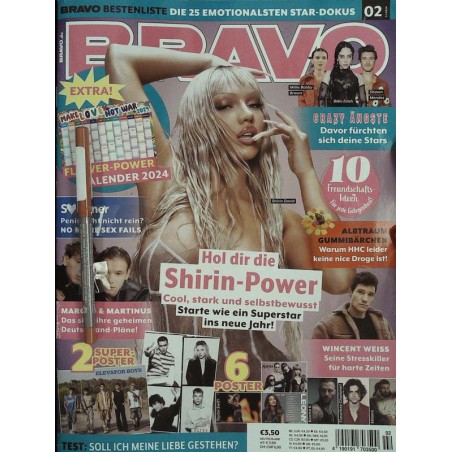 STARS & ENTERTAINMENT Hot Stuff u a mit Luciano, Rachel Zegler, Renee Rapp, Julienco und RAF Camora! Plus Geruchte-Check, Konzerte und Filme Shirin David Magische Power-Tipps von der selbstbewussten Rap-Queen Marcus & Martinus über ihre Veränderungen und ihre Deutschland-Pläne Badmomzjay Manche finden sie frech - und das ist ein großes Kompliment! Wincent Weiss, Katja Krasavice und viele weitere Stars über ihre Vorsätze für 2024 Emilio Der Schauspieler und Sänger im Exklusiv-Interview: Streiten findet er prima) Poster: Elevator Boys, Elite, Merneskin, Taylor Swift, Kontra K, Leony, Timothee Chalamet (zum Teil enthalten) Milano hatte es nicht leicht: der Rapper über seine krasse Vergangenheit Ellice muss sich entscheiden - die Sangerin im etwas anderen BRAVO Interview Star-Fragebogen Diesmal mit @idieserubi