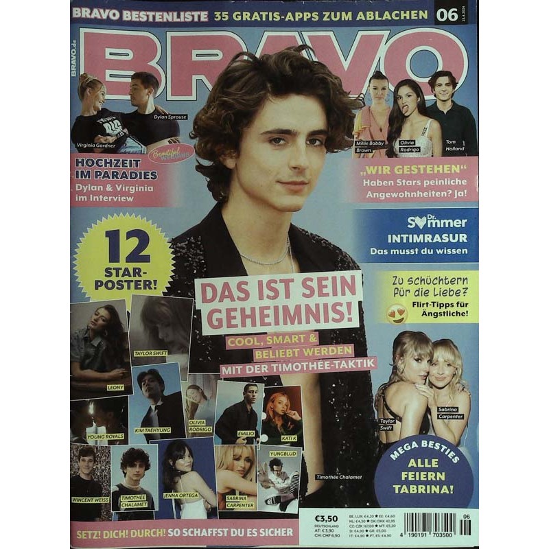 PLUS: Hochzeit im Paradies: Dylan & Virginia im Interview - Wir gestehen: Haben Stars peinliche Angewohnheiten? Ja! - Dr. Sommer für die Liebe? Flirt Tipps für Ängstliche - Mega Besties: Alle Feiern Tabrina! - Setz! Dich! Durch! So schaffst du es sicher - Poster: Taylor Swift, Olivia Rodrigo, Kim Taehyung, Leony, Young Royals, Wincent Weiss, Jenna Ortega, Sabrina Carpenter, Yungblud, Katik K, Emilio (zum Teil enthalten) - Bravo Bestenliste: 35 Gratis-Apps zum ablachen