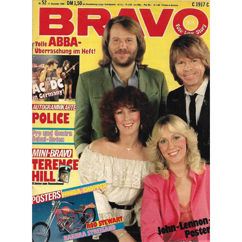 PLUS: AC/DC in Germany! - Autogrammkarte: Police (evtl. enthalten) - Pro und Contra Schulnoten - Mini Bravo: Terence Hill (evtl. enthalten) - Posters: Honda-Chopper; Rod Stewart; Barbara Streisand; John Lennon Poster (zum Teil enthalten)