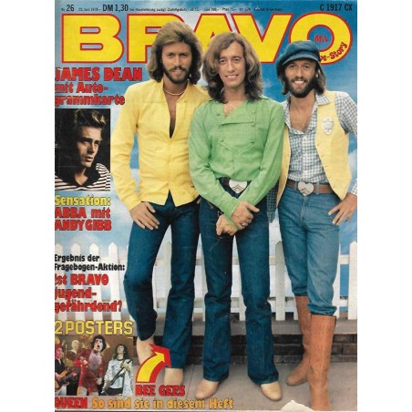 PLUS: James Dean mit Autogrammkarte (evtl. enthalten) - Sensation: ABBA mit Andy Gibb - Ergebnis der Fragebogen-Aktion: Ist Bravo jugendgefährdet? - 2 Posters: Queen; Bee Gees und viele mehr (zum Teil enthalten)