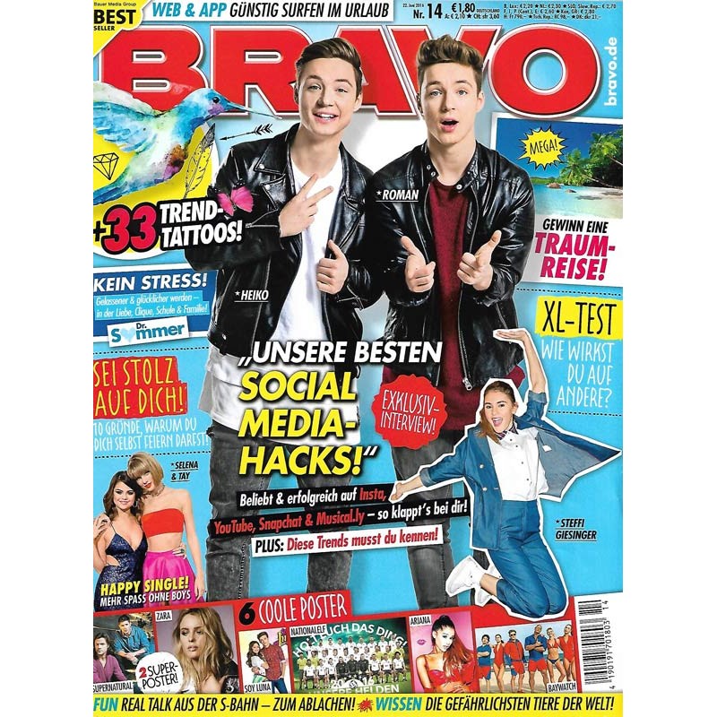 PLUS: 33 Trend Tattoos! (enthalten)- Dr. Sommer: Kein stress! Gelassener & glücklicher werden in der Liebe, Clique, Schule & Freizeit - Sei stolz auf dich: 10 Gründe, warum du dich selbst feiern darfst - Happy Single: Mehr Spaß ohne Boys wie bei Selene & Tay - XL-Test: Wie wirkst du auf andere? - Fun: Real Talk aus der S-Bahn, zum ablachen - Wissen: Die gefährlichsten Tiere der Welt - Poster: Supernatural; Zara; Soy Luna; Nationalelf; Ariana; Baywatch (zum Teil enthalten)