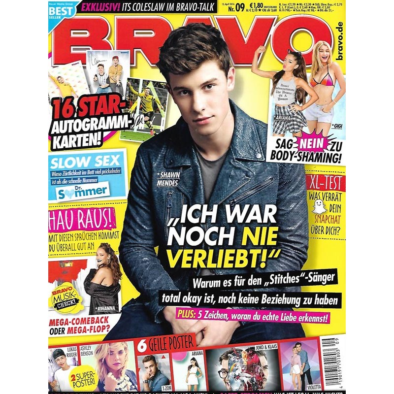 PLUS: Exklusic: Its Coleslaw im Bravo Talk - Sag nein zu Body Shaming wie Ariana Grande und Gigi - 16 Star Autogrammkarten (evtl. enthalten) - Dr. Somer: Slow Sex. Wieso Zärtlichkeit im Bett viel prickelnder ist als die schnelle Nummer - Hau Raus: Mit diesen Sprüchen kommst du überall gut an - Mega Comeback oder MEga FLopp? Rihanna im Musik Check - Report: Dennis. Ich mische die US Basketball Liga auf - Safer Streamen: Was ist legal, was nicht - Poster: Lukas Rieger; Ashley Benson; T-Zon; Ariana Grande; Joko & Klaas; Violetta (zum Teil enthalten)