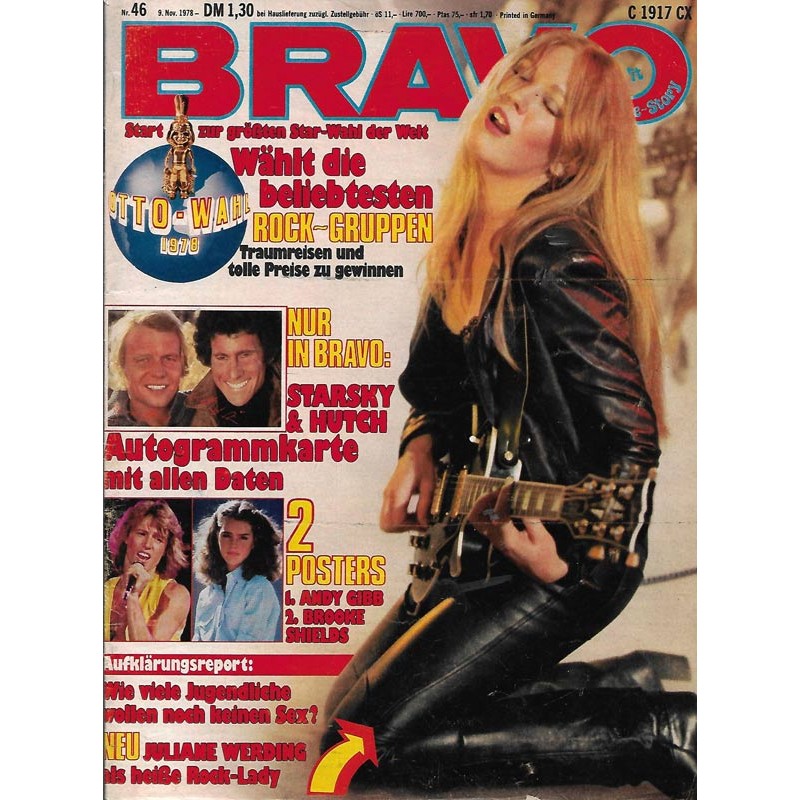 PLUS: Wählt die beliebtesten Rock-Gruppen - Nur in Bravo: Starsky & Hutch Autogrammkarte mit allen Daten (evtl. enthalten) - 2 Poster: Andy Gibb & Brooke Shields (zum Teil enthalten) - Aufklärungsreport: Wie viele Jugendliche wollen noch keinen Sex?