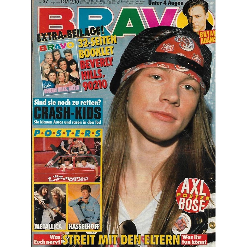 PLUS: Unter 4 Augen: Byan Adams - Extra Beilage: Beverly Hills 90210 (evtl. enthalten) - Sind sie noch zu retten? Crash Kids. Sie klauen Autos und rasen in den Tod - Was euch nervt: Streit mit den Eltern. Was iht un könnt - Poster: Die fantastischen vie; Metallica; David Hasselhoff; Axl Rose (zum Teil enthalten)