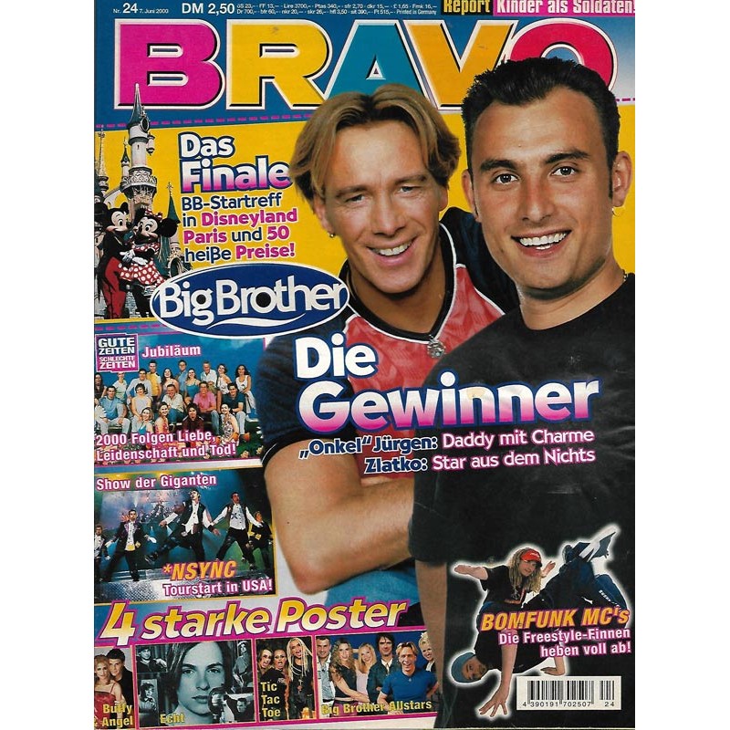 PLUS: Das Finale: BB-Strartreff in Disneyland Paris - Gute Zeiten schlechte Zeiten Jubiläum: 2000 Folgen Liebe, Leidenschaft und Tod - Show der Giganten: Nsync Tourstart in USA - Bomfunk MCs: Die Freestyle Finnen heben voll ab - Poster: Buffy Angel; Echt; Tic Tac Toe; Big Brother All Stars (zum Teil enthalten) - Report: Kinder als Soldaten