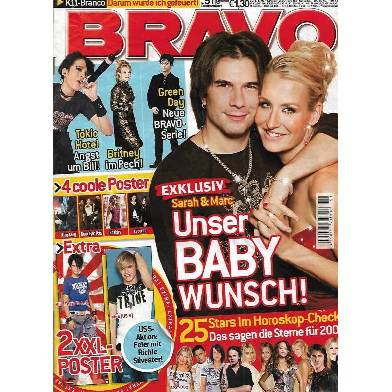 Stars: Stars aktuell: Marilyn Manson, Christina Aguilera und Notorious B.I.G. Richie von US 5: „Feier mit mir Silvester! Britney Spears: Warum sie nie glücklich wird kagerou: Die vier J-Rocker geben Vollgas! DSDS: BRAVO sucht den Super-Klon Eminem: Warum er wieder heiraten will Tokio Hotel: Schock — Tourstopp wegen Grippe! Ben von "BRAVO TV": „Ich will wieder rocken! Green Day: Das Erfolgsgeheimnis von Billie Joe Samy Deluxe: Er zeigt in BRAVO, wer der Boss ist! Mischa Barton: Neuer Look für den „O.C."-Star Das große BRAVO-Star-Horoskop: Was Deine Lieblingsstars 2006 erwartet Muhabbet: BRAVO zu Hause beim Schmusesänger Check!: Brandneue CDs, DVDs und Games Songbook: Sean Paul und Tokio Hotel Chart News: Charts, Tourdaten Exit: B-Tight, Madonna, Ben über sein „BRAVO TV"- Jahr 2005 und das Dr.-Sommer-Mobil Party-Alarm!: Paris Hilton & Stavros u.a. feiern ab
