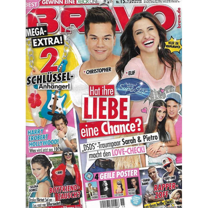 PLUS: Harry Style erobert Hollywood! Was wird jetzt aus 1D? - Selene Gomez & Riri Boyfriend-Tausch? Drake flirtet Selena an, Justin rast vor Eifersucht! Und was sagt Rihanna dazu? - Farid Bang & Kay One Rapper-Zoff um dieses heiße Chicks! - Extra: 2 Schlüsselanhänger (evtl. enthalten) - Poster: Bella Thorne; Drake; Lily Allen; Michael Trevino (zum Teil enthalten)
