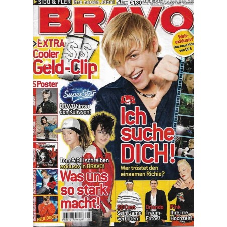 PLUS: Sido & Fler: Ihre neuen Jobs - DSDS: Bravo hinter den Kulissen - Tom & Bill schreiben exklusiv in Bravo! Was uns so stark macht - 50 Cent: Sein Game verboten! - Orlando Bloom: Traumfotos - Pink: Ihre irre Hochzeit - Poster: Eminem; GZSZ-Josie; Tokio Hotel Tourplakat; Stephan-Fan-Poster DSDS; Stephan-Fan-Poster DSDS Heul doch (zum Teil enthalten) - Extra: Cooler Geld Clip (evtl. enthalten)