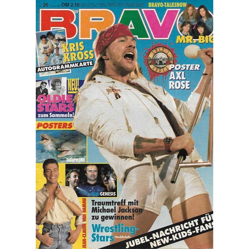 PLUS: Bravo Talkshow: Mr. Big - Kris Kross: Autogrammkarte (evtl. enthalten) - Neu!: Oldie Stars zu sammlen - Traumtreff mit Michael Jackson zu gewinnen - Wrestlingstars: Steckbriefe - Jubel Nachricht für New-Kids-Fans - Poster: Jean Claude Van Damme; Delphine; Genesis; Axl Rose (zum Teil enthalten)
