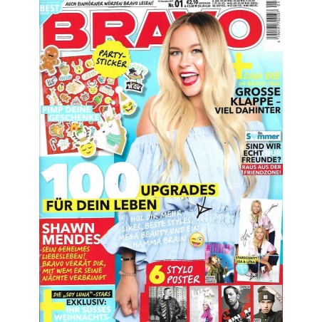 PLUS: 100 Upgrades für dein Leben: Hol dir mehr Likes, beste Styles, Mega Beauty und ein Hamma Brain - Shawn Mendes: Sein geheimes Liebesleben! Bravo verrät dir, mit wem er seine Nächte verbringt - Die Soy Luna Stars: Ihr süßes Weihnachtsmädchen - Dr. Sommer: Sind wir echt nur freunde? Raus aus der Friendzone - Poster: Farid Bang; Lina; Eminem; Ariana Grande; Mike Singer, Starschnitt Lisa & Lena (zum Teil enthalten) - Extra: Party Sticker (evtl. enthalten)