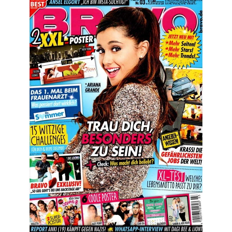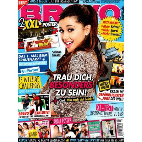 PLUS: Ansel Elgort: Ich bin Insta Süchtig - Dr. Sommer: Das 1. Mal beim Frauen arzt, was passiert dorch wirklich? - 15 witzige Challenges: Für dich und deine Freunde - Die Lochis: Bravo Exklusic, so gehts bei uns Backstage ab - Report: Anki 19 Jahre kämpft gegen Nazis - Whatsapp Interview: Mit Dagi Bee & Liont - XL Test: Welches Lebensmotto passt zu dir? - Angeber Wissen: Krass! Die gefährlichsten Jobs der Welt - Poster: Violetta; Köln 50667; Katy Perry; Star DJs; Kalender; Selena Gomez; New York; Shirin & Ado Kojo (zum Teil enthalten)