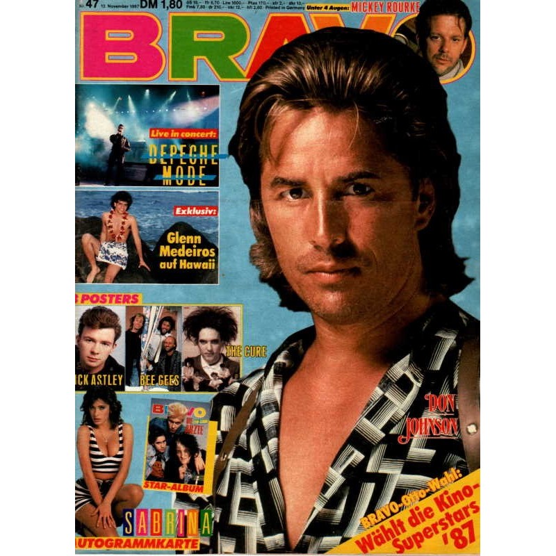 PLUS: Unter 4 Augen: Mickey Rouge - Live in concert: Depeche Mode - Exklusiv: Glenn Medeiros auf Hawaii - Bravo Otto Wahl: Wählt die Kino Superstars 1987 - Autogrammkarte: Sabrina (evtl. enthalten) - Poster: Rick Astley, Bee Gees, The Cure (zum Teil enthalten) - Star Album: Die Ärzte (evtl. enthalten)