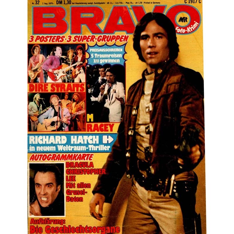 PLUS: Autogrammkarte: Dracula Christopher Lee, mit allen Gruseldaten (evtl. enthalten) - Aufklärung: Die Geschlechtsorgane - Poster: Dire Straits, Racey (zum Teil enthalten)