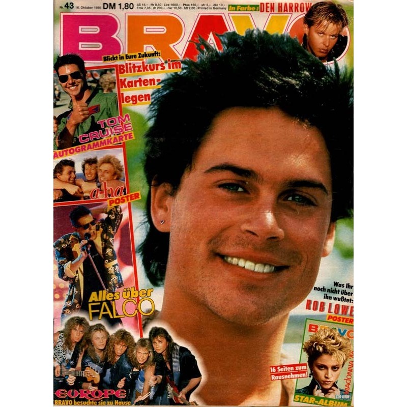 PLUS: In Farbe: Den Harrow - Blickt in eure Zukunft: Blitzkurs in Kartenlegen - Autogrammkarte: Tom Cruise (evtl. enthalten) - Star Album: Madonna 86 (evtl. enthalten) - Poster: a-ha, Rob Lowe, Falco uvm. (zum Teil enthalten) - Alles über Falco - Europe: Bravo besuchte Sie zu Hause