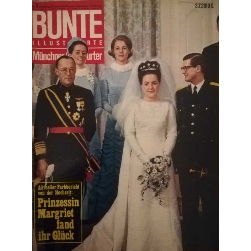 ZUM TITELBILD: Mit Prinzessin Margriet trat die dritte der vier Töchter des holländischen Königspaares vor den Traualtar. Auf unserem Bild Prinz Bernhard, Prinzessin Margriet und ihr Gemahl, Pieter van Vollenhoven (Im Hintergrund die beiden Brautjungfern Baroneß Bentinck und Fräulein Brandsma). Lesen Sie unseren großen Farbbericht über die Hochzeit in Den Haag