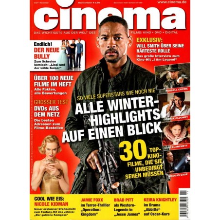 Titelgeschichte: DIE BESTEN FILME DES WINTERS Jetzt beginnt die Hochsaison für Filmgourmets, Hollywood schickt seine Oscar-Kandidaten ins Rennen. CINEMA stellt die bewegendsten Dramen, die schrillsten Komödien und die größten Action-Kracher vor. Darunter: Megastar Will Smith in dem Science-Fiction-Thriller „I Am Legend"