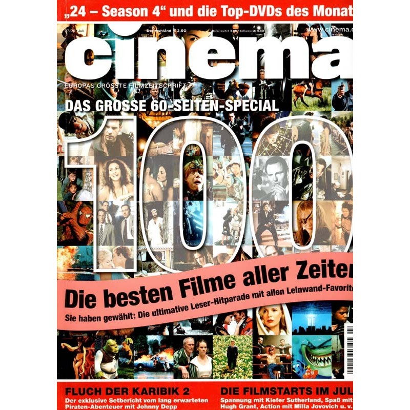 Thema des Monats DIE 100 BESTEN FILME ALLER ZEITEN Insgesamt 22.239 Leser haben ihr Votum abgegeben. So ist eine repräsentative Liste Ihrer Lieblingsfilme entstanden. Dazu haben wir u. a. einige Bestleistungen aus der Filmgeschichte zusammengetragen: Die bewegendsten Momente Die schrägsten Fortbewegungsmittel Die größten Krawallmacher Filme, die nicht fortgesetzt werden sollten Die leidenschaftlichsten Leinwand-Küsse Die heftigsten Bleigewitter Die überflüssigsten Remakes Die verblüffendsten Storywendungen Modische Trendsetter und Verfehlungen Romane, die wir als Film sehen wollen Leinwandpaare mit hohem Schmelzfaktor Die Hassliste der CINEMA-Redaktion Die schrecklichsten Monster Die härtesten Gegenspieler Die wildesten Verfolgungsjagden Die peinlichsten Fehlbesetzungen Filme, die die Welt verändert haben Die 101 besten Drehbücher aller Zeiten Die filmischsten Garnes Die Vorfreude auf „Fluch der Karibik 2" Die Frisuren von Samuel L. Jackson Die charismatischsten Bösewichte